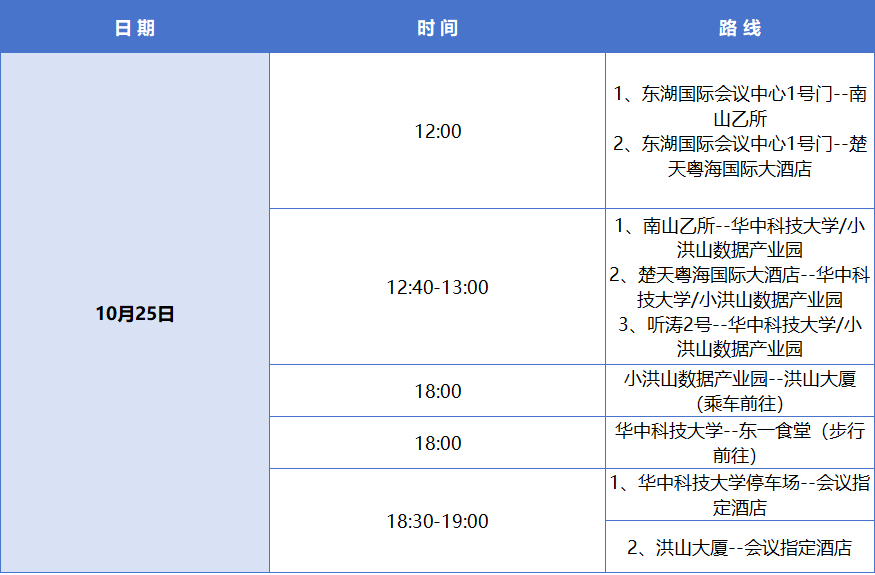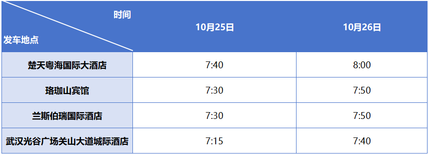 会议期间,楚天粤海国际大酒店、珞珈山宾馆、兰斯伯瑞国际酒店、武汉光谷广场关山大道城际酒店前往东湖宾馆的车辆,具体时间安排如下(其他酒店参会者自行安排)